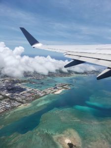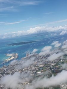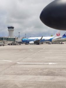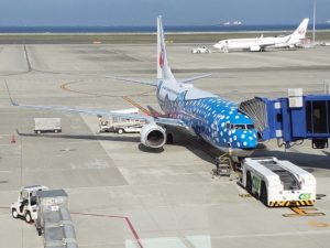 7:45発の那覇行きで出発。 ジンベイジェットに当たりました。 JTAの乗務員さんが乗っているので皆さんアロハシャツで、こちらも沖縄行くんだ!というテンションになってきます。 |