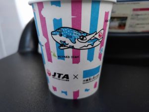 | 飲み物サービスの紙コップがジンベイジェット用のものになっていました! 空港を北に向けて飛び立ち、左旋回しながら志摩半島を横切り、紀伊半島に出ると左側座席は当分海だけです。 |