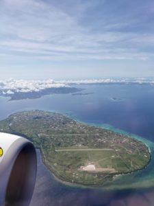 日よけを下ろして一眠りすると、喜界島が見えてきました。右側座席の人は奄美大島を見ているようです。
