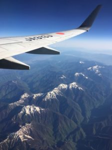 南アルプス上空を過ぎていきますが、翼のすぐ下あたりにははるか遠くの北アルプスが雪をかぶっている様子も分かります。 |