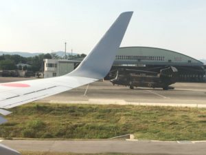 阿蘇の外輪山の外側に出ると、高台にある熊本空港が右奥に見え、右旋回で着陸します。 自衛隊のヘリも訓練なのか準備をしていました。 |