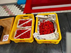 | 羽田―山形はE190が活躍しています。95人乗りでWIFIはありませんが一人席のクラスJが最強です。 | さすがサクランボが最盛期ということで、見世物とはいえこんなものがターンテーブルへ。 |