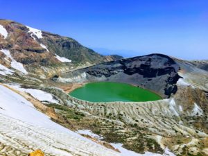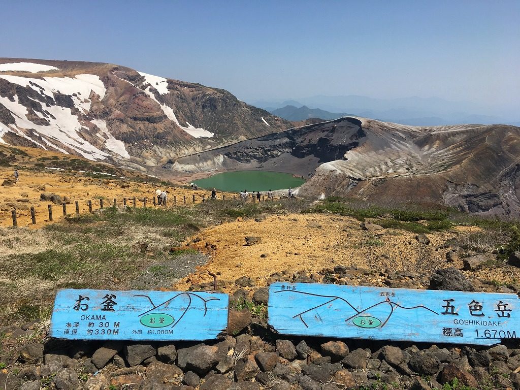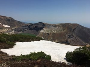 | しかし月曜日の朝というのに、中国人の団体やら、東北の方々ぽいツアーバスが沢山来ていますねー。 御釜の近くといっても、このぐらいまでしか行けませんが、足元は正直未整備なので悪いです。整備されてる所で撮影している方が大半でした。 まだまだ雪は残っていますが、回廊のようなものがあるわけではありません。 |