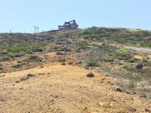 | 蔵王ハイラインは、さらに御釜の入り口まで行く有料道路で、ここを走るか、手間のリフト乗り場に止めて、リフトで上がるかの選択肢がありますが、ドライブ目的なので前者を選択。 しかし、何回かカーブをするとあっけなく到着します。 レストハウスを通っていくと、御釜と神社への道に分かれます。 |
