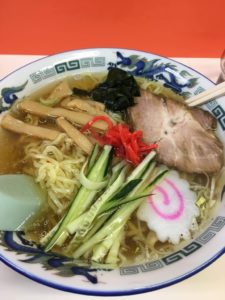 | 山形名物の冷やしラーメンで体を冷やします。 これだけ見ると普通の中華そばですが、実はスープが冷たいんです! つゆは普通に中華そばなので、違和感なくいただくことが出来ました! |