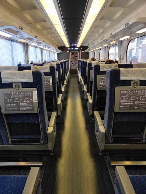3両編成のロングシートが当たり前、トイレ無し編成で2時間以上走るのもありますから、ここはちょうどいい具合に8両編成で走る列車を選んでいます。