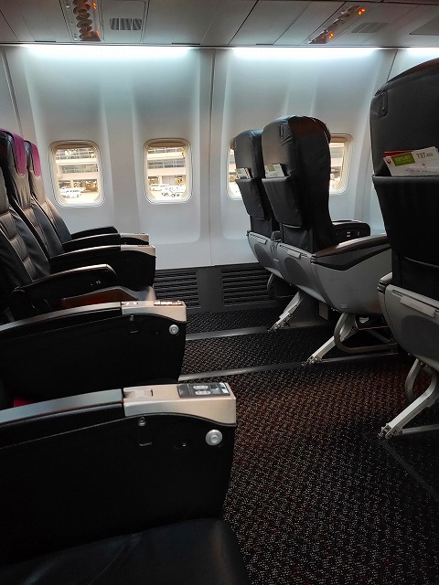 搭乗2日前くらいにメールで搭乗案内がくると、ホームページにアクセスすると意外に座席の変更が容易になっています。それまでは後方の窓側を取っていますが、今回は15KとクラスJのすぐ後ろの席を取れました。
