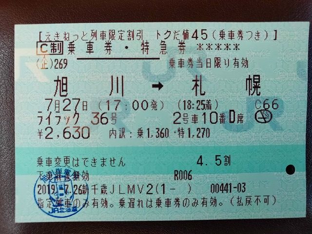 但し、問題があり、いまだ手元に持っているトクだ値45の旭川→札幌のチケットです。