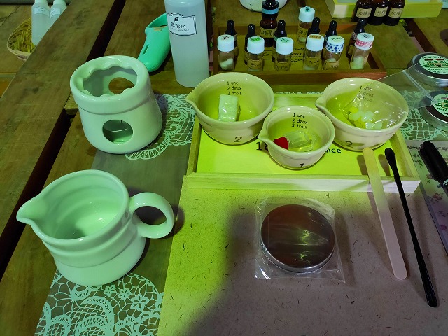 体験コースは、左上のローソクのついたものにカップをのせて、その右にあるシアバター、ホホバオイル、白と黄色の粒の蜜ろうを溶かしていき、混ぜ合わせます。