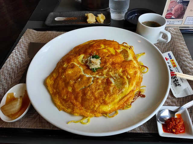 メニューの中に、北見塩焼きそばをアレンジしたオム塩焼きそばがあったので注文!左の漬物は玉ねぎの漬物、右にあるのは、特製の辛いタレで、それをかけると魚ジャンの香りがマッチングしてより美味しくなります。