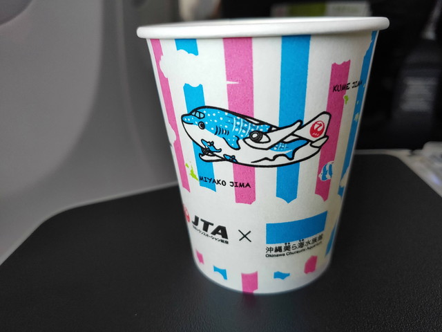 飲み物のサービスは青ジンベエザメのロゴ入り。