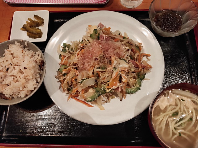手堅く、まーさん道に入ってゴーヤチャンプルーと八重山そばの定食にしました。