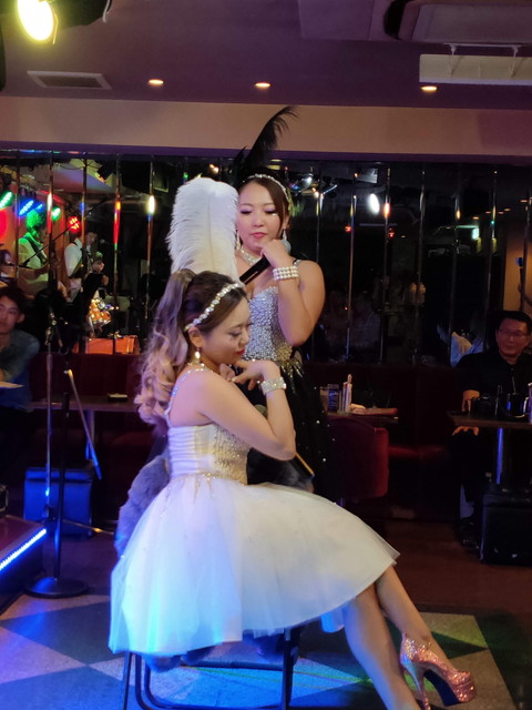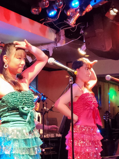 お店の美雪社長(左)と尾道・せとだレモン大使のシンガーソングライター葉月美姫さん(右)のユニット。ピンクレディーのトリビュートがメインです。