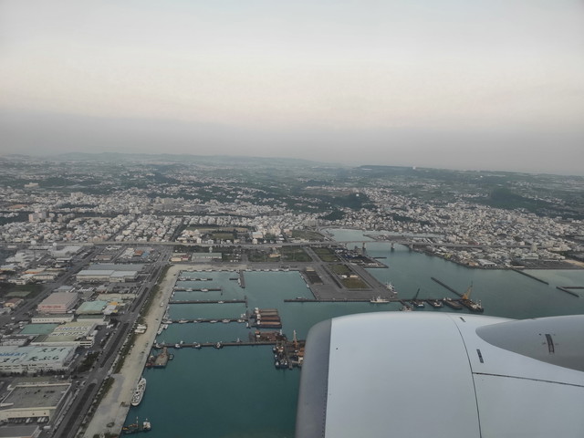 機長からも混雑で着陸順番待ちとのアナウンスがあり、島の南海上をぐるぐる回ります。20分くらい回ってようやく着陸。