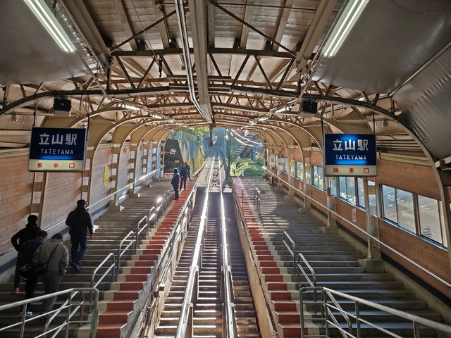 立山駅を出て階段を下りて振り返ったところです。建物右側にきっぷ売り場があって、事前予約した人もここできっぷと引き換えになります。