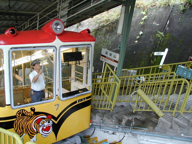 L字型にホームが出来ているので、駅舎の中を抜けていくと、ケーブルカーの改札があります。車両自体は信貴山の守り神である寅が描かれており、車体も黄色ですが、阪神タイガースとは関係ないようです(笑)。