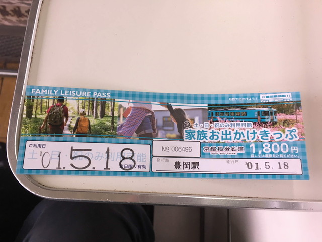 使ったきっぷは家族お出かけきっぷ。大人1名と小人1名が同時に利用出来ますが、1名で利用しても豊岡~天橋立往復でモトが取れます。(片道運賃が1200円)※現在きっぷの販売価格は1850円、インターネット割引で1650円