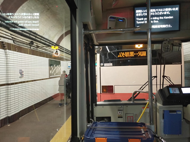 トンネルを抜けると終点のアナウンスが流れてきます。架線は取り払われたものの、ポールは立ったままでトロリーバスの趣が残る感じです。