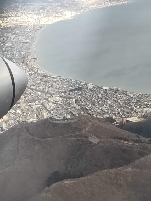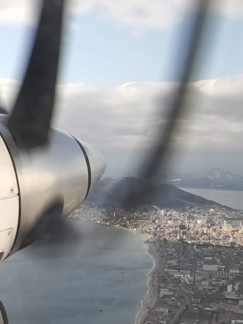 離陸して上昇していく間に函館山の北側を通過します。ちょうどプロペラの先端あたりに展望台が見える感じです。