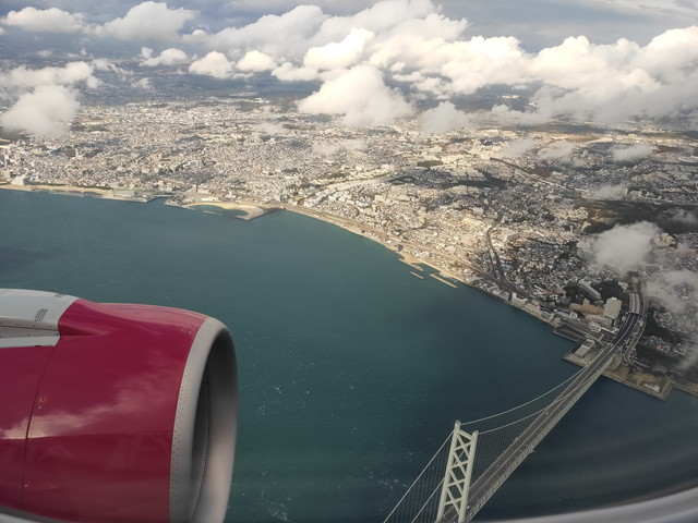 航路の設定からか、明石海峡大橋の上空を降下していきます。