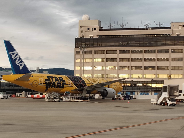 ANAの黄色機も駐機していました。この飛行機は小回りがきくので、誘導路も軽快に走っていき、滑走路に着いたら一息いれずに加速して飛び立っていきます。