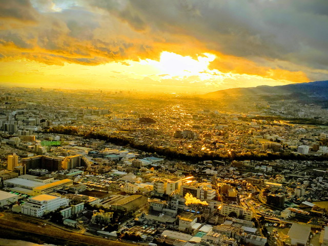 離陸後旋回していくと夕焼けの街がきれいに見られました。この後は雲の中に入っていきます。