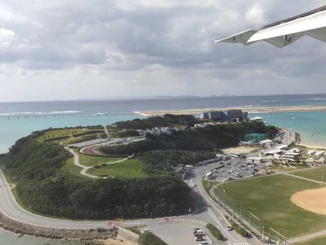 瀬長島を横目に着陸。奥には建設中の第二滑走路が見えます。