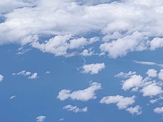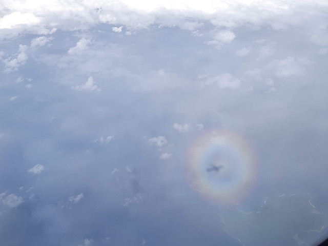 奄美大島を通過中に、1分に満たない時間でしたが、ブロッケン現象(飛行機の影が雲に映りこみ、虹のような光が見られる)が確認出来ました。