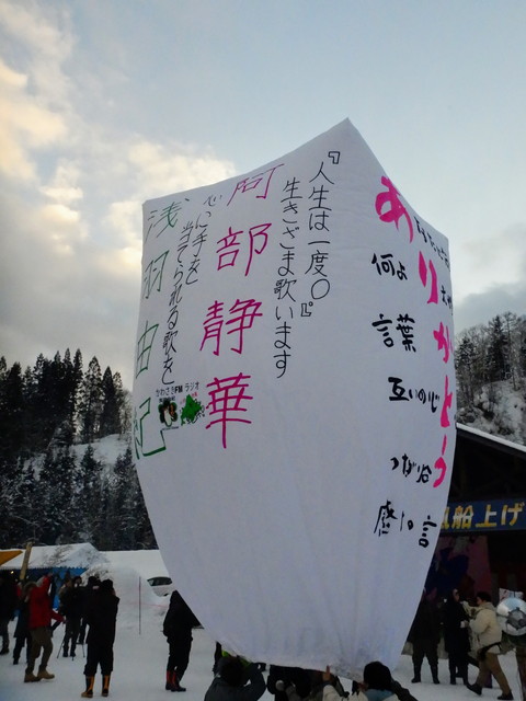 今回来たのは、シンガーソングライター阿部静華さんが縁あってこの祭りで歌うことが出来るだけでなく、なんと地域の人が作る紙風船に自分の名前とか思いとかを書いて揚げることが出来るというもの。普段ではまずないことですが、メッセージ性の強い歌を届けた成果が出ました。
