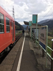 | 大阪に出てサンダーバードで福井へ向かいます。 | 九頭竜線(越美北線)は高校生がほとんどでした。18きっぷの人も多いですね。 | 一乗谷駅で降ります。キハ120だと少し旅情は落ちますね。やはり58,28でないと。 |