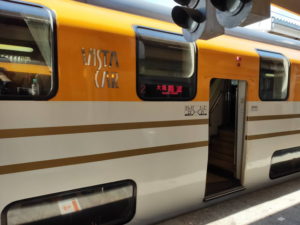 | 近鉄名古屋から伊勢中川までビスタカーを利用していきます。いい具合にビスタカー2本乗り継いで行きます。 | 伊勢中川からのビスタカー。結局どちらも混んでましたが、3連休じゃしょうがないですね。終点大阪難波まで。 |