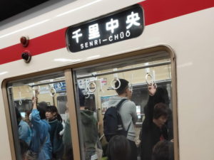 | ここから地下鉄に乗り換えてみました。次の乗り換えを考えて一番後ろの車両に乗ります。 | 千里中央からモノレール乗り場は地上を歩いて乗り換えます。ゆえに地下鉄の乗る場所を間違えるとかなり乗り換え時間が変わります。 |