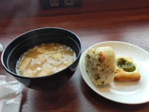 | パンは3種類出てました。カレーパンは?と探してたら出来立てが来ました。ケシの実パンが有名なのかな? | おにぎりも2種類。鶏五目と鮭だったかな? |