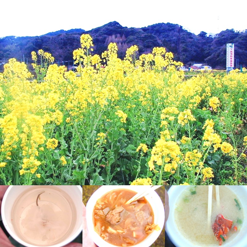 上にある菜の花は、下田から石廊崎方面のバスに乗って日野バス停で下車、徒歩3分ほどで行ける広大な菜の花畑で撮影したものです。