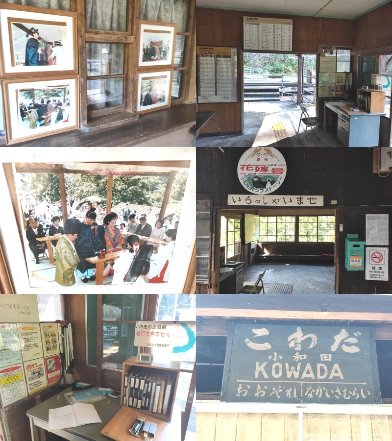 駅舎内はこの駅で結婚式を挙げたご夫婦の写真が残る