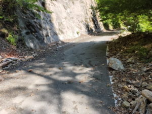 | 旧佐久間町浦川から愛知県の豊根村や長野県の天龍村を経て飯田市に向かう3県にまたがる珍しい県道ですが、佐久間ダムからしばらくは発電所に向かうダンプカーとすれ違うこともあり、待避所があります。手掘りのトンネルはトンネル入り口で直角に曲がったりと見通しが悪いので要注意です。 ほとんど直線がなく、曲がってばかりの道が1時間ほど続く一本道です。 |