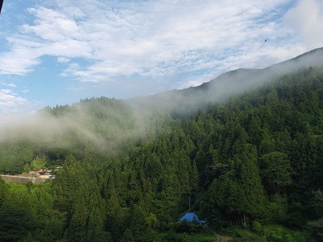 朝起きて部屋の窓を開けたらうっすらと青空が見えてきました。山の上の方は雲がかかっていたり鳥の鳴き声が元気に聞こえてきます。よく考えてみればエアコンをつけずに窓を開けていればよほど涼しかったと思うのですが、網戸がないので虫が入ってきちゃいますからだめなのでしょうね。