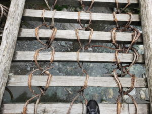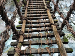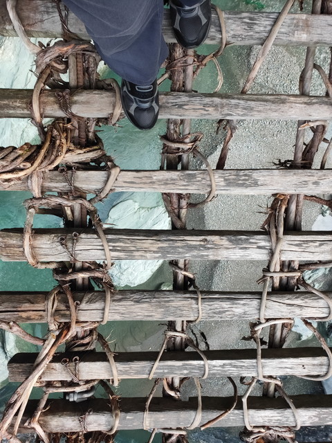 以前にも歩いたことがあるのですが絶妙な揺れ具合と上から見る川底までの高さとほどよく広がった橋の幅で、高所恐怖症の人が一歩で固まると思われます。 そうは簡単に川に落ちるとは思えませんが、足はスポッと抜けそうですし、携帯やカメラを落とせば間違いなく川に落ちるでしょう。それでもビビりながらなんとか対岸まで歩くことができました。