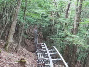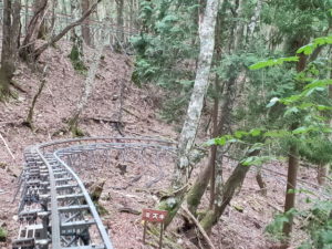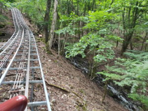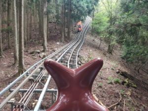 走り出すと歩くのが少し早いくらいのペースでレールの上を進んでいきます。いわゆるみかん畑とかにあるモノレールの現代版といった感じですが整備も行き届いておりますし、 最初の1 km くらいが行き帰り同じ途中の1.7kg が周遊区間となります。ものすごい急勾配もたくさんありますがその度に椅子の角度が変わるのでそれほどきつくはありません。基本的には森の中を進むので雨が振り込むことがさほどないですが一応雨よけはついています。 それほどスピードは出ませんが途中風通しが良い区間を通るので結構風が冷たいです。スタートの標高は750 M ですが最高地点は1350 M くらいまで上がるので温度変化は結構感じました。自分も長袖のシャツに風よけの長袖を1枚着てちょうど良かったです。 1時間ほど森の中を歩く感じになるので、良い気分転換になりますしこれだけの規模のモノレールは国内ではここぐらいだと思うので乗る価値は十分にあると思います。 |