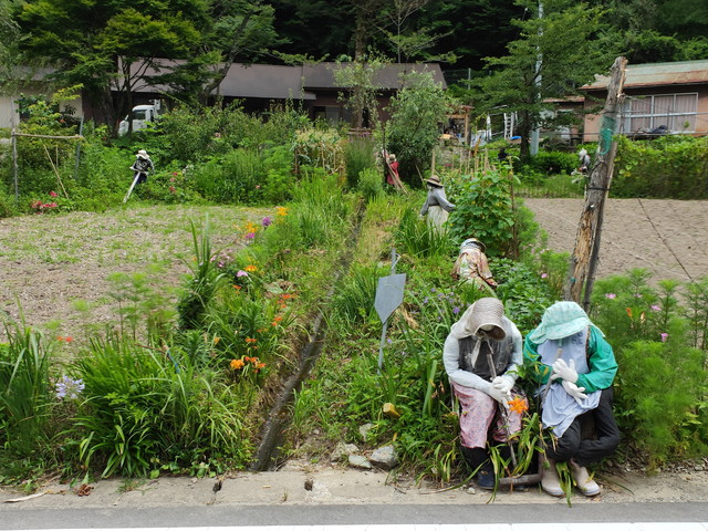 ますます道が細くなっていく中を走っていくと名頃地区に入ります。急に道端にたくさんの人影が見えるので何事かと思うと全てカカシです。かかしの里と名前がついているのですが特に何があるわけでもなくただカカシが無雑作に置かれているというシュールな場所です。