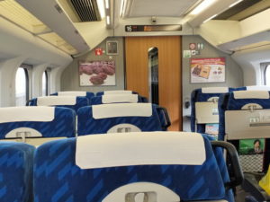 天気も回復してきて、12時19分発のつばさ135号に乗車します。福島まではやまびこ号と繋いで走るので先頭の16号車17号車の自由席まで歩いて行くのは結構大変です。乗り換え時間の間ではぎりぎりぐらいです。30%くらいの乗車率でしたので安心して座って行きます 。 |