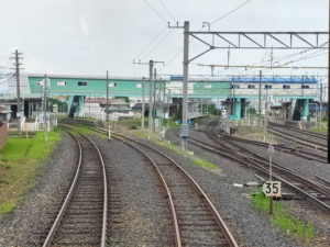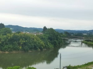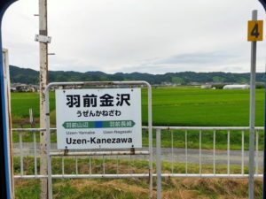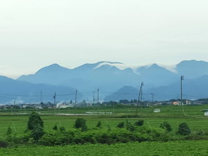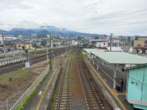 ただ郡山の駅で昼ご飯を買う余裕がなかったので、初日に購入した高知の芋けんぴとビスケットの袋を取り出しているご飯の代わりにしました。 福島から高架を降りて在来線の奥羽本線に入っていきます。一気に勾配がきつくなって一歩も止まらなくなった赤岩駅や、かつてスイッチバックだった板谷駅峠駅大沢駅を通過していきつつ米沢駅に到着します。 |