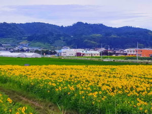 | 左沢線の15時32分発のキハ100形は4両編成でやってきました。こちらも高校生が多く乗っていますが4両あるので余裕で座ることができます。 スピードは最高でも60km/hくらいです。 周辺にはひまわり畑がきれいに咲いていました。 |