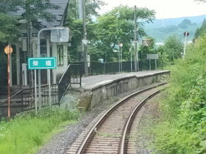 | 途中の寒河江でかなりの人が降りて空いてきました。車掌さんも手持ち無沙汰なのか、車内のカーテンをもとに戻したりしています。 残って乗車しているのは青春18きっぷを持ってる人が多いようです。 終点1つ前の柴橋は2両分しかホームがないので、後ろ2両はドアが開きません。16時8分に終点左沢へ到着です。 |