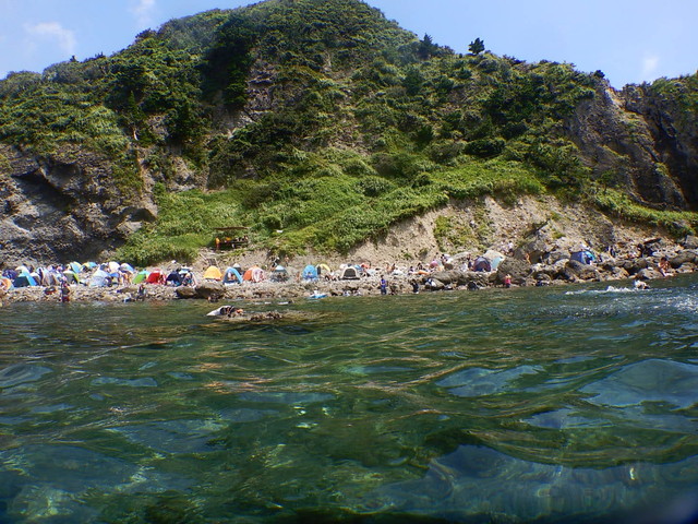 乗船券売り場をテントで購入して船に乗り込みますが、お昼時ということもあってか、浜から一旦戻って食事に来たりする人もいます。乗船券は一日中何度でも往復出来るので、使い方次第といったところでしょう。
