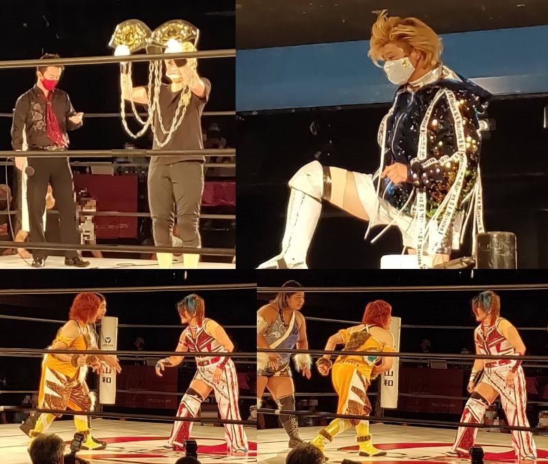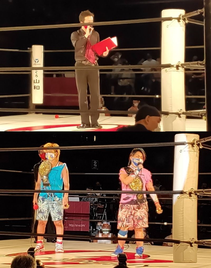 メインイベントのタッグチャンピオンチーム、AKINO選手と加藤選手が挨拶をしていよいよ開始です。