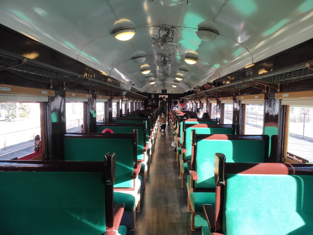 連結されている車両は旧型客車と呼ばれるもので、ニス塗りの木製の床で、白熱灯ライトが使われています。ドアは手で開けるようになっています。ロックは自動でかかるようです。