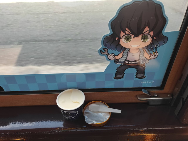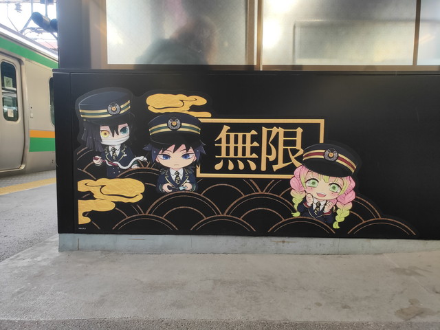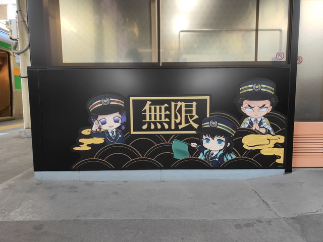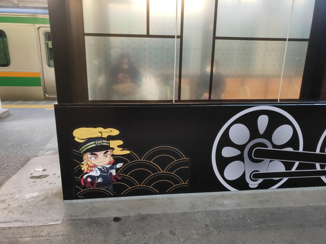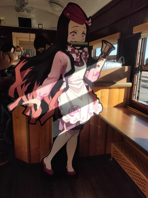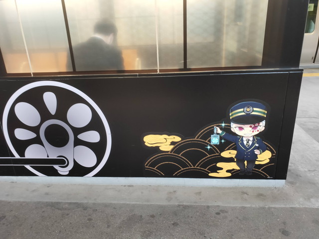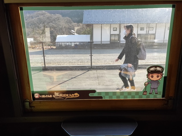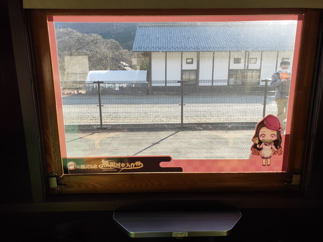 停車駅の駅名標の所にはキャラクターのシールが貼られており、車内においては、チャイムが鳴った後、機関助士として乗務している竈門炭治郎が何度か列車の案内などをしてくれます。