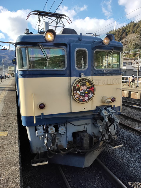 上り列車は先頭が電気機関車、一番後ろに蒸気機関車のD51がいます。どちらにも鬼滅の刃専用のヘッドマークが取り付けられており、主に親子連れが盛んに写真を撮っていました。