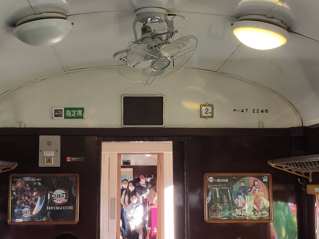 しかも車内は暖房がめちゃくちゃ効いていて上着を2枚脱いでちょうどいいくらいでした。 頭のネジが緩んでる人が多少いるので、大きい声が飛び交っていますし、空調設備などというものはなくただ扇風機が回っているだけなので換気はすき間風頼みといったところです。